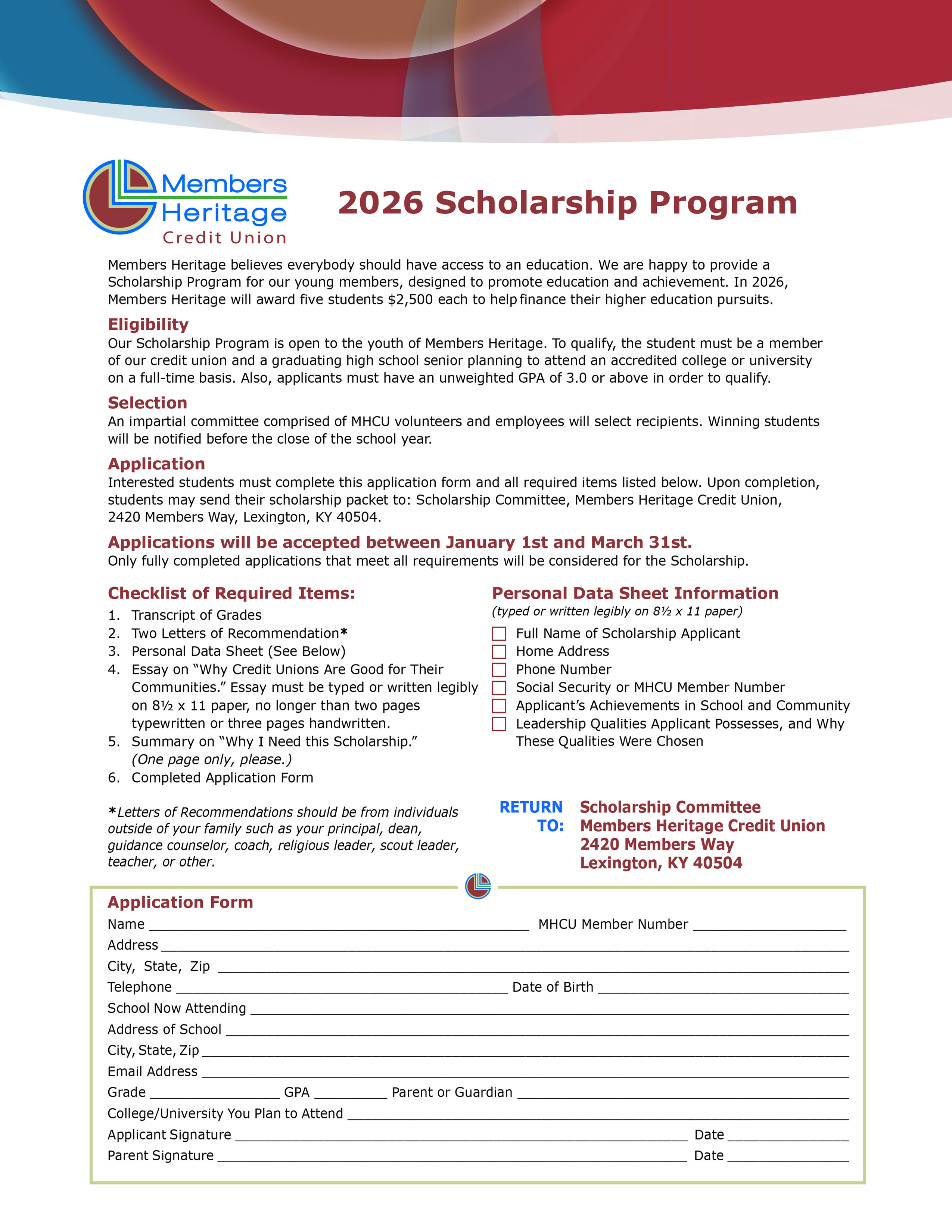 Members Heritage believes everyone should have access to an education. We’re happy to provide an annual Scholarship Program for our young members to promote academic achievement.